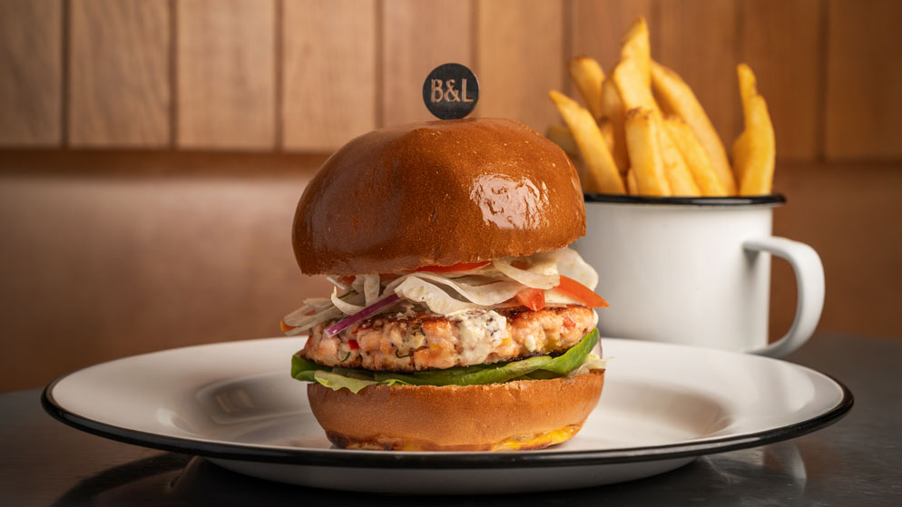 自家製新鮮三文魚漢堡扒,加入刁草、甜椒及洋蔥,並配以酸豆及醃青瓜增添口感。配上刨薄茴香、番茄、紅洋蔥及牛油生菜,佐以清新開胃的他他醬。